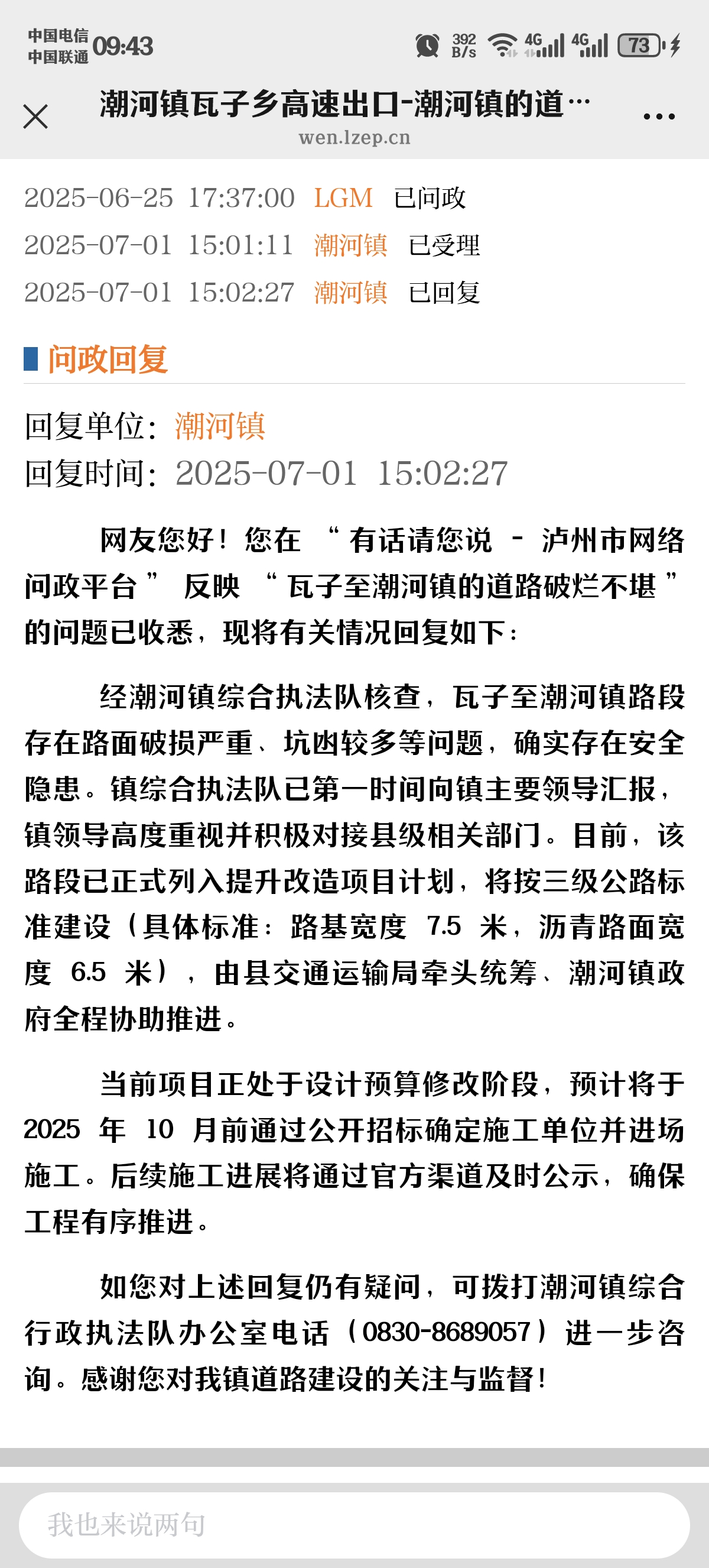 网友您好!您在“有话请您说-泸州市网络问政平台”上反映“关于瓦子到大坝的道路维修情况咨询”的问题,我们已收悉,现回复如下。