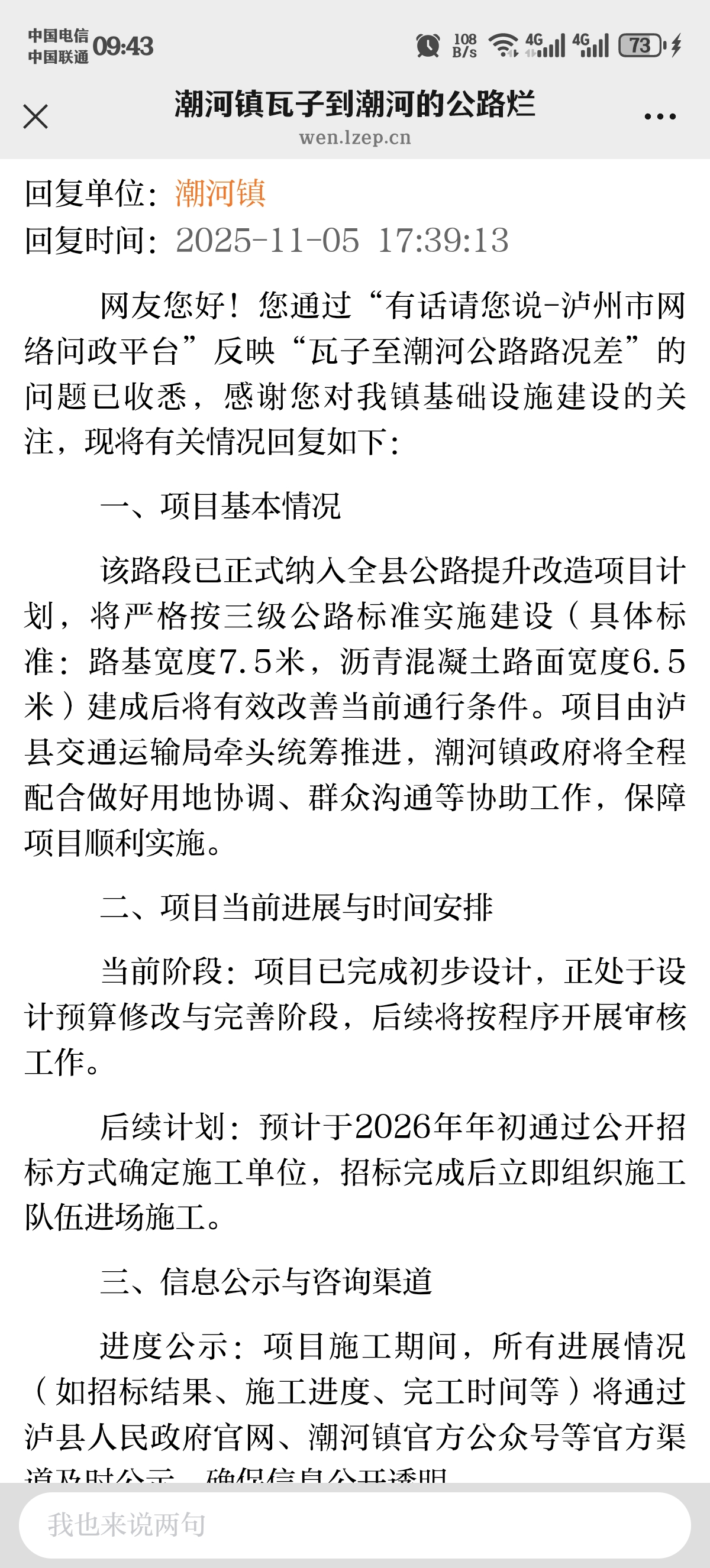 我翻看了潮河镇的网友问政问题,关于瓦子到大坝的道路维修情况的咨询特别多且比较频繁。也从相关部门的回复中看到了一点点进步,但是同样的问题,为什么有的回复2025年10月公开招标,有的回复2026年年初公开招标?请问原计划2025年10月的公开招标为什么没有按既定计划进行?这马上又到2026年年初了,请问若是年初一过,依旧没有确定施工单位,相关部门打算再次以什么理由推到什么时候?