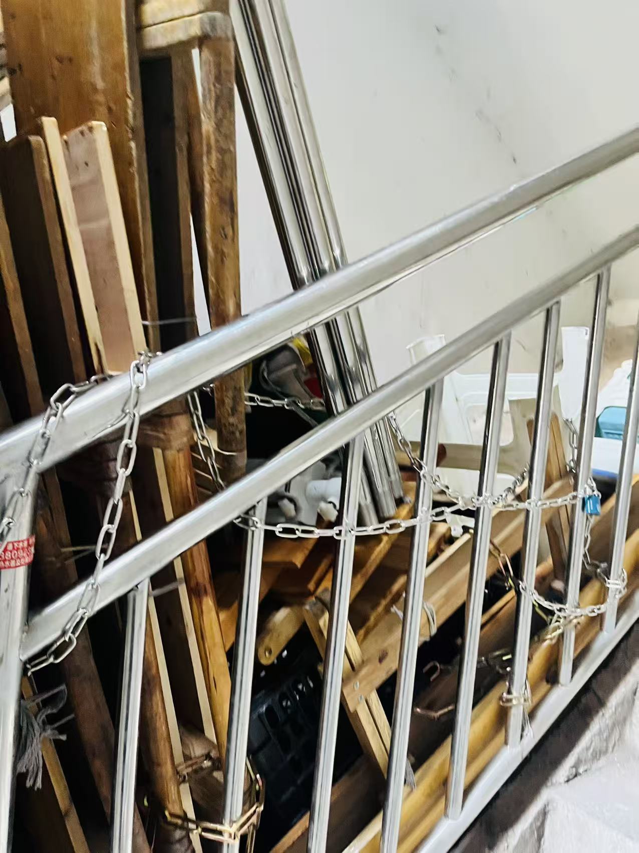 大北街32栋4单位为高层无电梯的散居楼栋。近期,802住户(据其自称为本楼栋小组长)因夜间经营夜市,每日白天将其摆摊所用的桌椅板凳等大量杂物,长期堆放在1楼、3楼至4楼之间的公共过道中,并且使用铁链将部分物品锁在楼道墙面上。