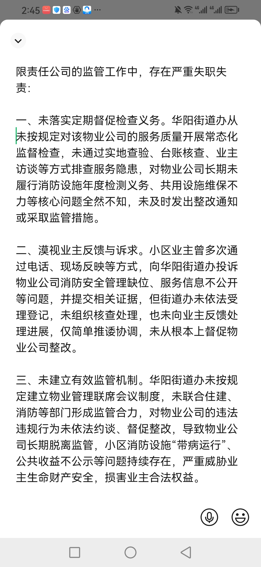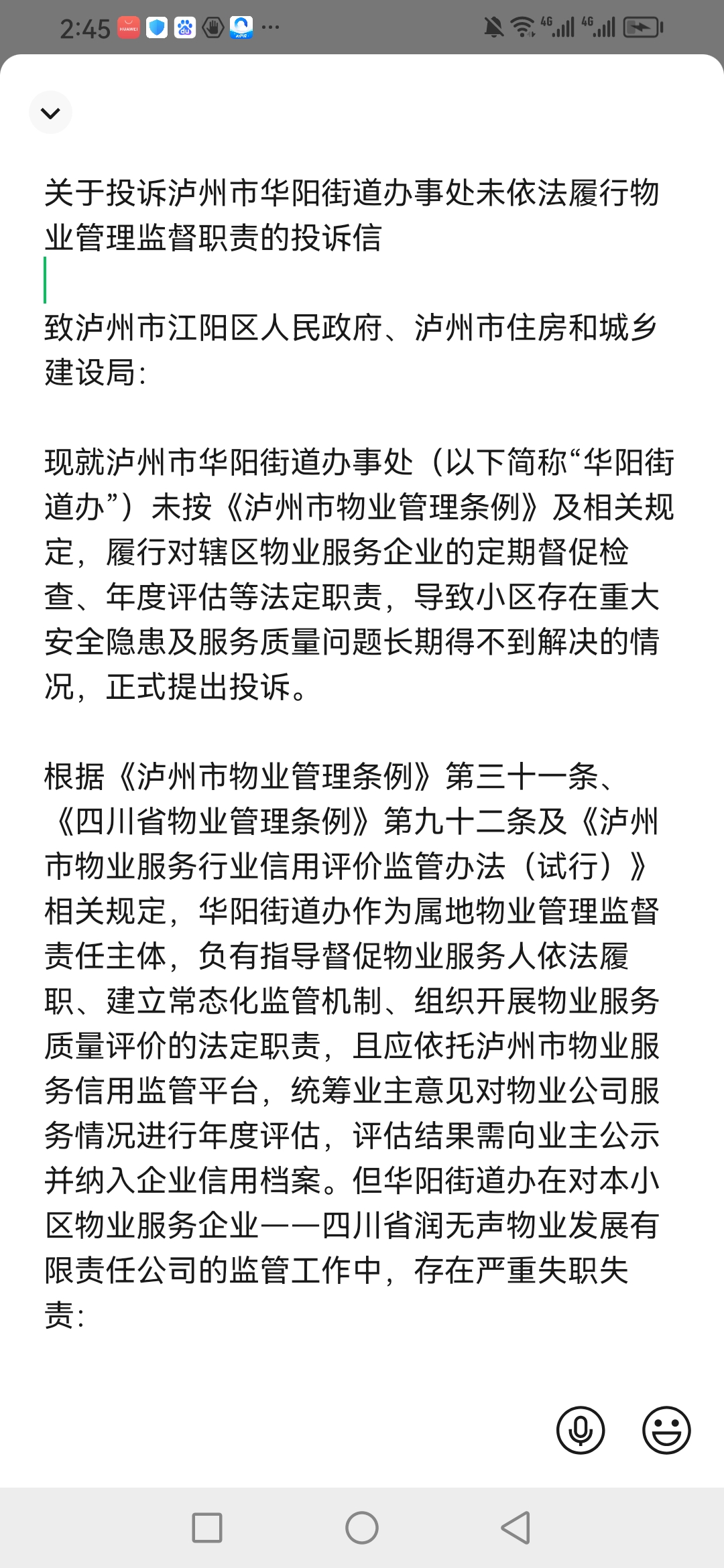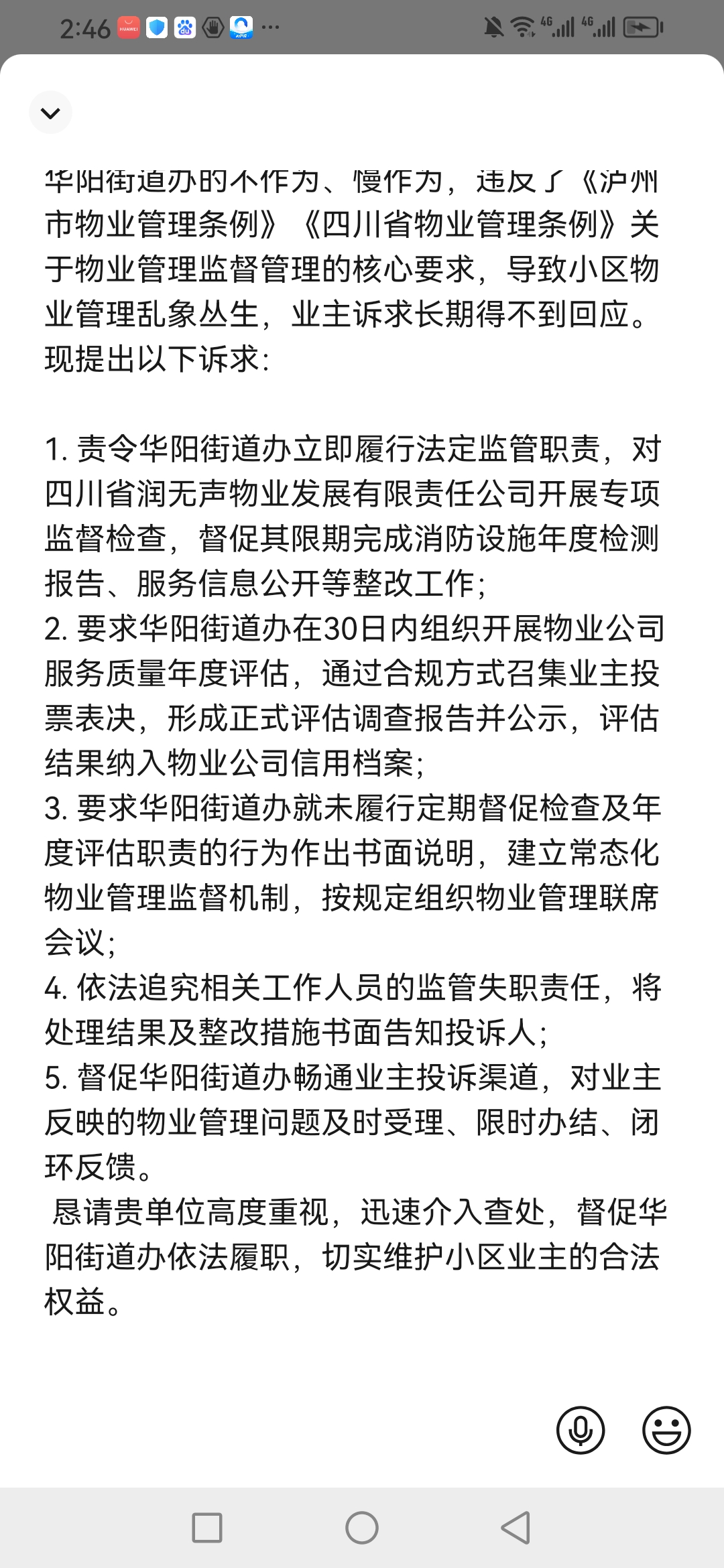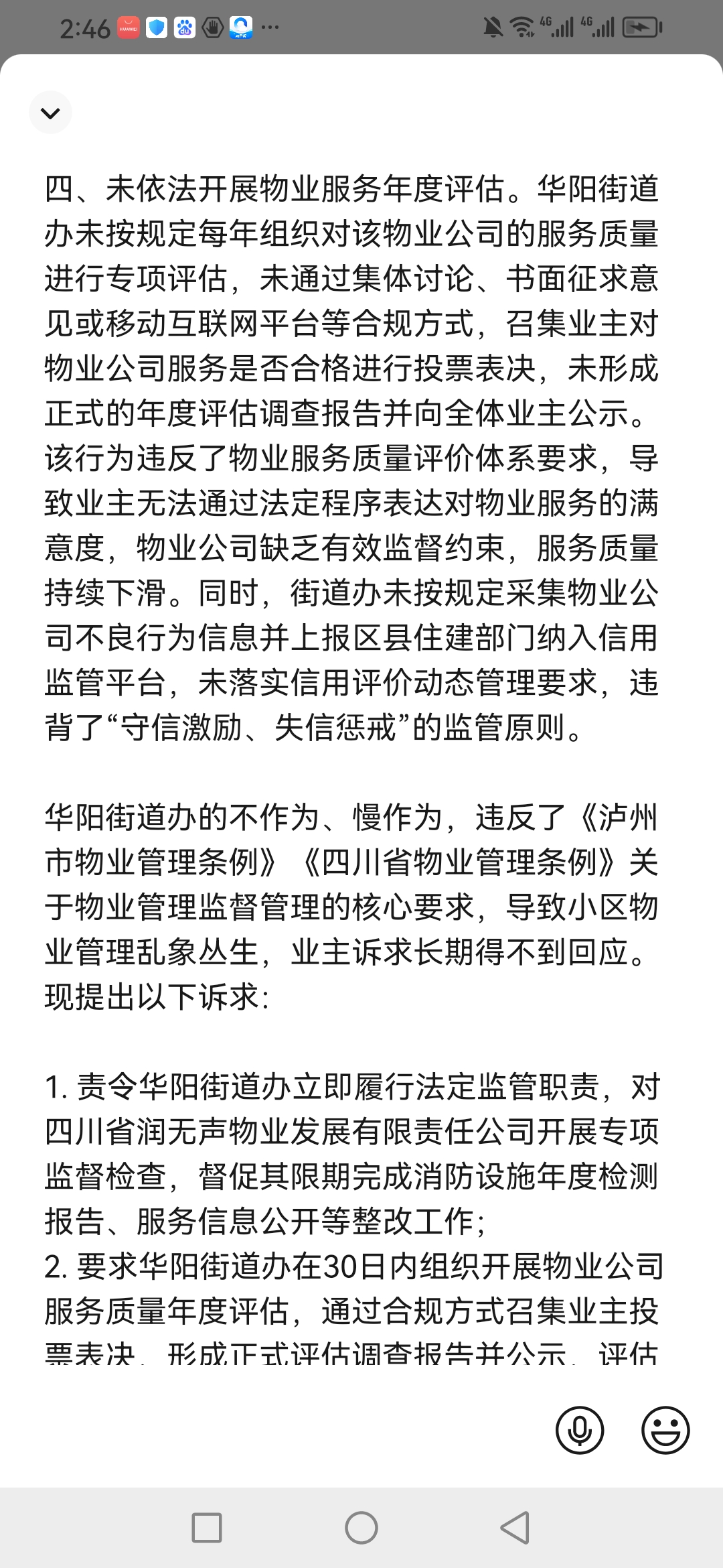 关于泸州市华阳街道办事处依法履行物业管理监督职责的诉求