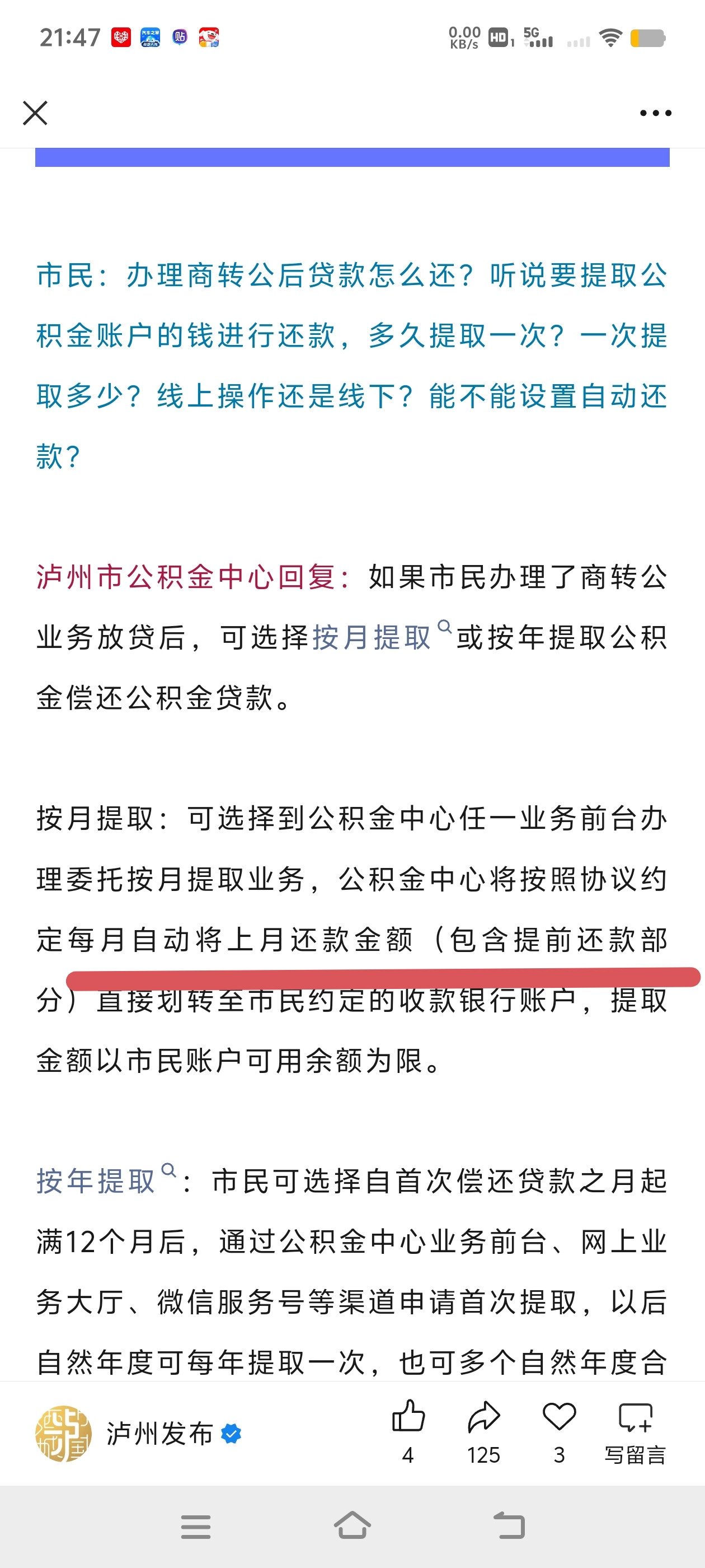 您好!您通过新闻网-问政平台咨询的“我于2025年7-8月办理了商转公,在办理过程中,银行那边要我提前还款了一部分房贷,当时问公积金中心提前还款部分能不能提取,答复不能,现在泸州公积金中心在服务号里统一回复提前还款部分可以提取,请问我这个情况怎么处理呢”的问题已收悉,我单位已于1月14日进行了认真解读,现将处理情况回复如下: