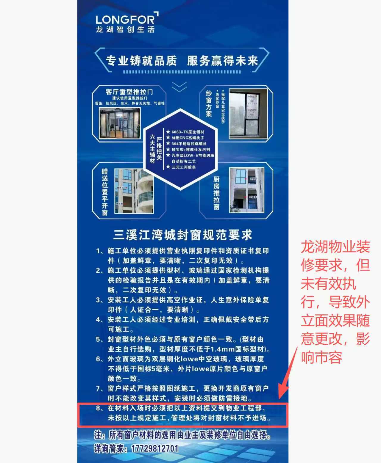 三溪江湾城A组团小区,本小区目前部分业主已完成装修,但装修过程中外立面已被随意更改,导致小区外立面已无最初规划设计模样,严重影响整个小区的形象和品质。在此期间,我认为物业管理公司存在严重管理问题,没有尽到物业公司应有的职责,以致目前整个小区城市形象严重受损。请相关部门务必认真核实,根据城市规划部门验收通过的小区外立面形象,对违反相关要求的单位及人员进行督促整改,以达到最初规划要求,给整个小区恢复原有形象。