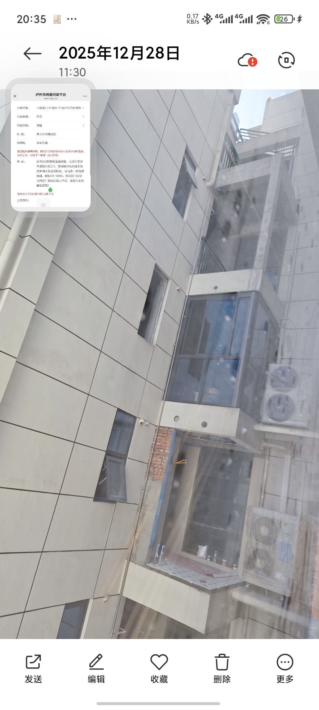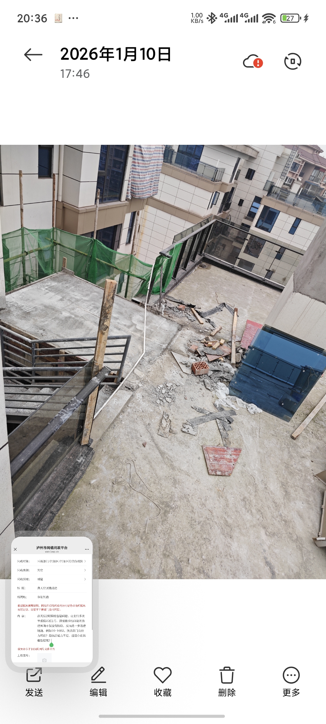 鑫天宸2期顶楼违建问题,业主们多次举报投诉近1月,顶楼楼梯出口处的违建围墙不仅没有拆除,反而进一步违建现浇,例如10-1602。执法部门公信力何在?是执法能力不足,还是另有隐情?