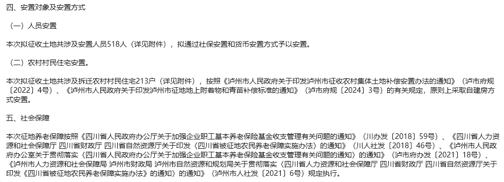 经核实,目前正在开展泸州至古蔺高速公路项目(纳溪段)征地前期工作,尚未发布征收土地公告。目前该征地项目被征地人员安置和被拆迁农民住宅房屋安置均按照《泸州市人民政府关于印发泸州市征收农村集体土地补偿安置办法的通知》(泸市府规〔2022〕4号)第三章和第四章规定执行。在正式征收土地公告发布后补偿安置实施前,若有新政策出台,则按照新政策执行。