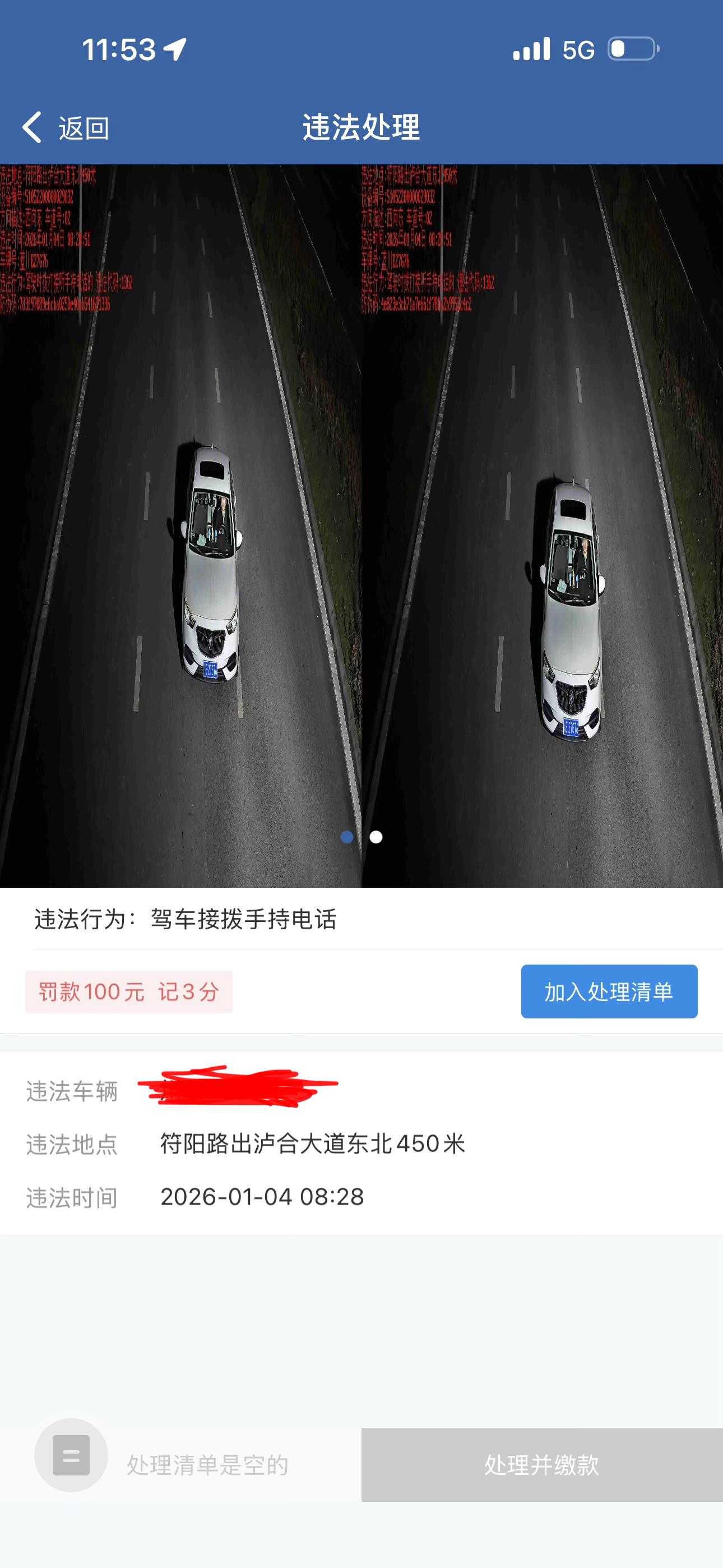 2026年1月4日08:28,在符阳路出泸合大道东北450米被摄像头拍到驾车接拨电话都违法行为。对此我有两个疑问:1、8.28都已经天亮了,为什么拍摄图片是在晚上?我同一时间和同一点我还有一样的违法记录,这张照片就是白天拍摄的?为什么同意地点同意时间拍摄的图片环境不一样?2、图片放大没有手机在耳边接电话动作。请处理!