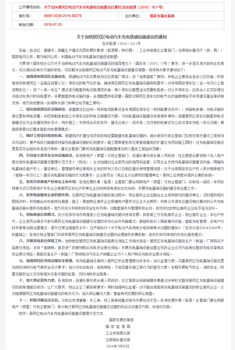 《国家发展改革委 国家能源局 工业和信息化部 住房城乡建设部关于加快居民区电动汽车充电基础设施建设的通知》