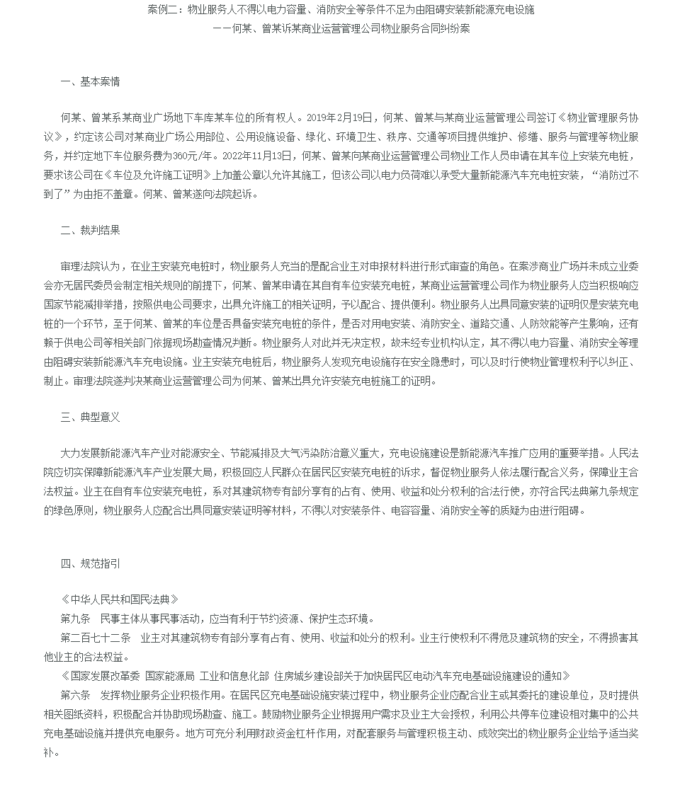 4.社区对最新的典型案例了解不够深入,大力发展新能源汽车产业对能源安全、节能减排及大气污染防治意义重大,充电设施建设是新能源汽车推广应用的重要举措。人民法院应切实保障新能源汽车产业发展大局,积极回应人民群众在居民区安装充电桩的诉求,督促物业服务人依法履行配合义务,保障业主合法权益。业主在自有车位安装充电桩,系对其建筑物专有部分享有的占有、使用、收益和处分权利的合法行使,亦符合民法典第九条规定的绿色原则,物业服务人应配合出具同意安装证明等材料,不得以对安装条件、电容容量、消防安全等的质疑为由进行阻碍。