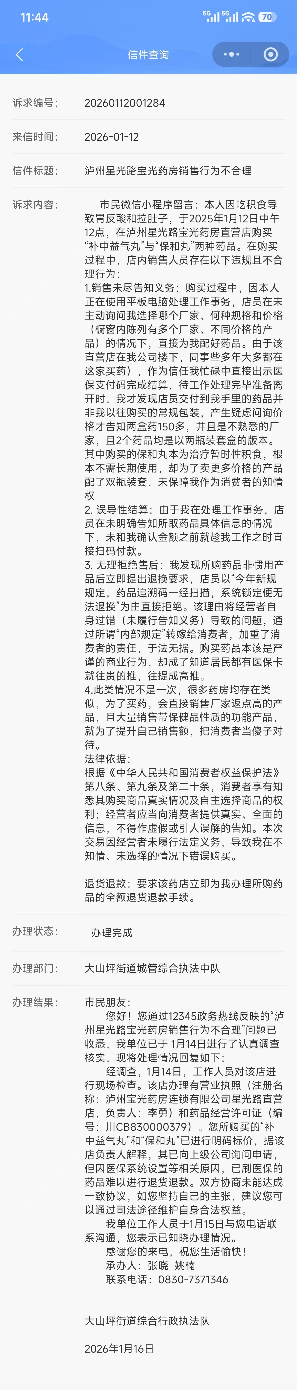 接到相关问政事项后,1月27日,我街道工作人员再次与泸州宝光药房负责人进行沟通调解。经协调,双方已达成一致处理意见,该公司表示将加强员工在销售过程中与客户的沟通能力培训,确保到店的消费者能获得清晰的产品讲解、专业的用药指导和贴心的服务体验,切实保障消费者的合法权益。