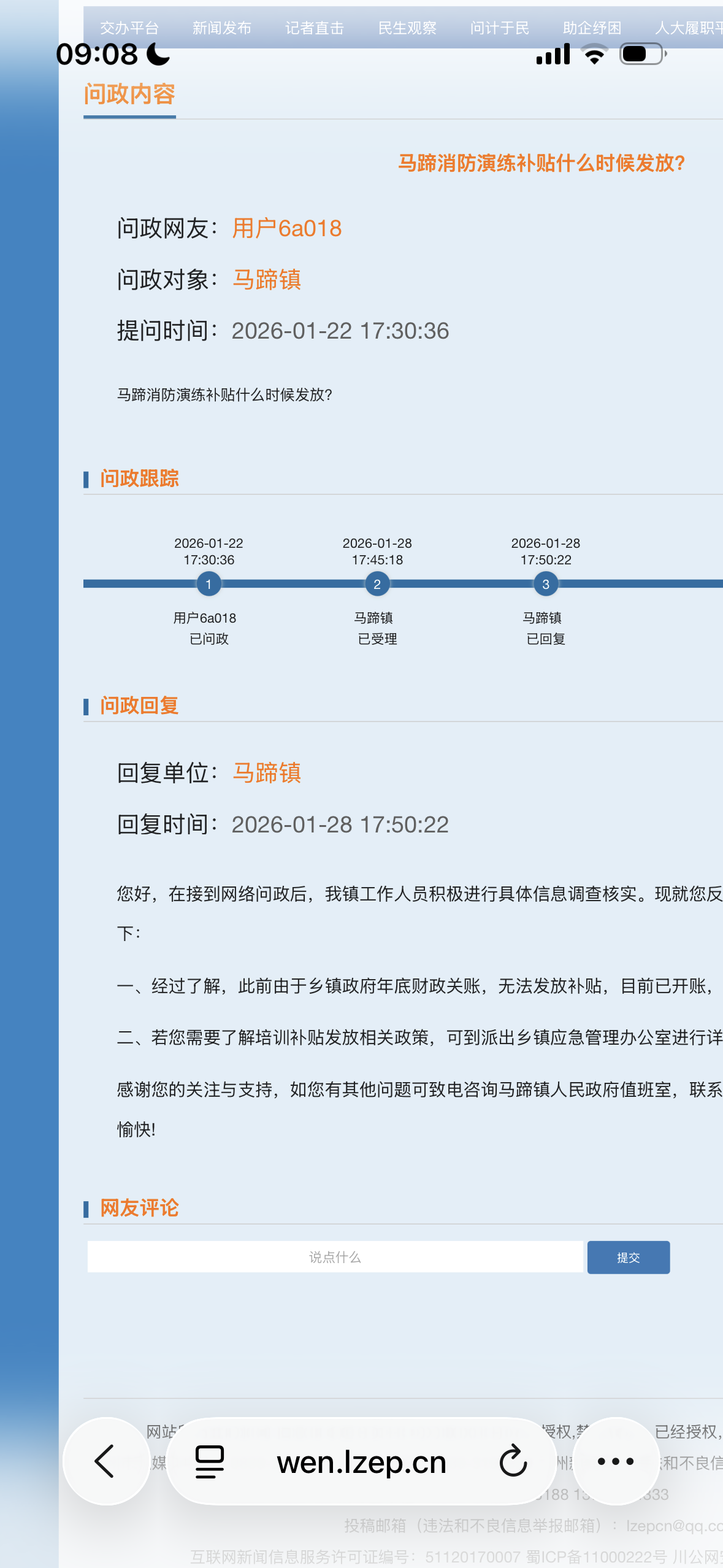在诸多“关于消防应急补贴何时发放”这个问题下,马蹄镇的回复话术一直都是这样,敷衍。据本地乡镇和应急管理局了解,这笔资金早在25年就已经发放到马蹄乡镇,但是一直在踢皮球,影响及其恶劣
