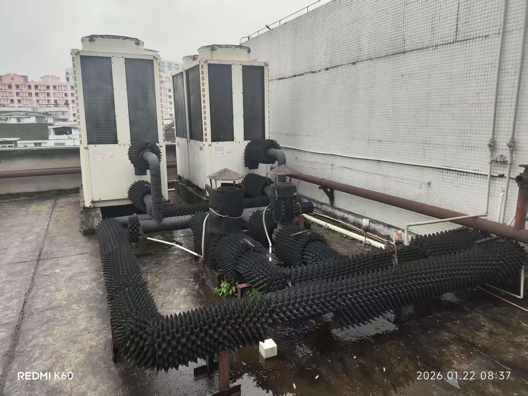 经核实,该场所空调外机设置于该栋楼顶层,使用水循环,声音由设备运转时振动产生,该主机底部、管道外部均加装有隔音垫、隔音棉等降噪措施。根据我局职能职责已督促该企业加强设备维护保养,确保运转时在限定“声音外排”标准内。