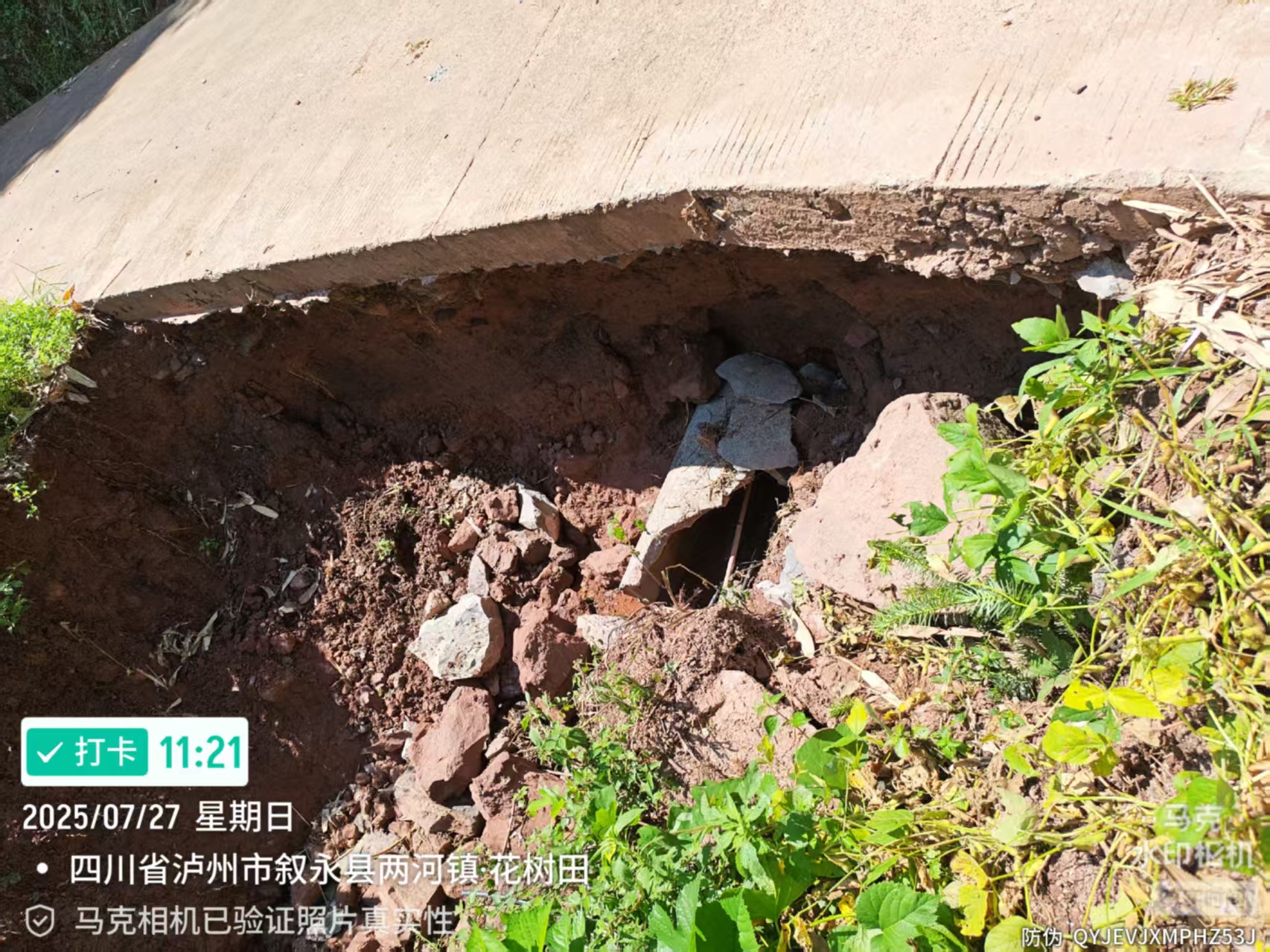 于2025年7月因洪水,造成学堂平至插牌公路多段因洪水造成涵洞冲垮,路基损毁,造成公路表面上是可以正常通行,实际混凝土下面路基17己被冲毁,造成了严重安全隐患,于2025年7月27日通过微信群上报于社级,村级领导,多次在微信群上报,到今天为止,没有一块安全提示牌,以级采取安全防范措施!望各级领导实查!