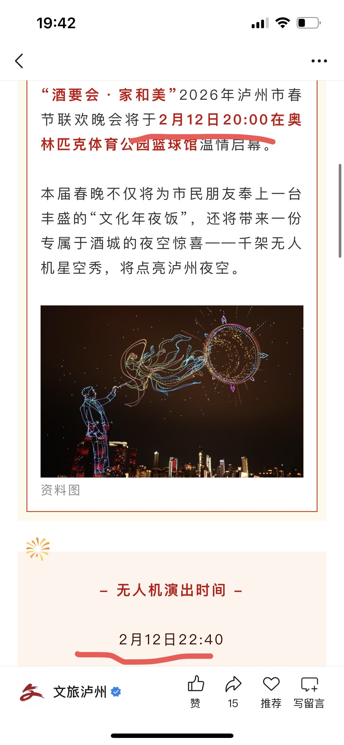 之前泸州市文旅和其他官方号都发的2月12日无人机秀是十点四十开始,很多泸州市民都大晚上按着官方号发的时间拖家带口去看,想着是官方号发的,肯定是很严肃的事情,会准时开始,没想到大晚上那么冷,拖家带口去被告知提前就结束了,也没有任何通知,大过年的,太伤害泸州市民的感情了,昨晚很多泸州市民扑了空。不能准时就不要写具体时间。