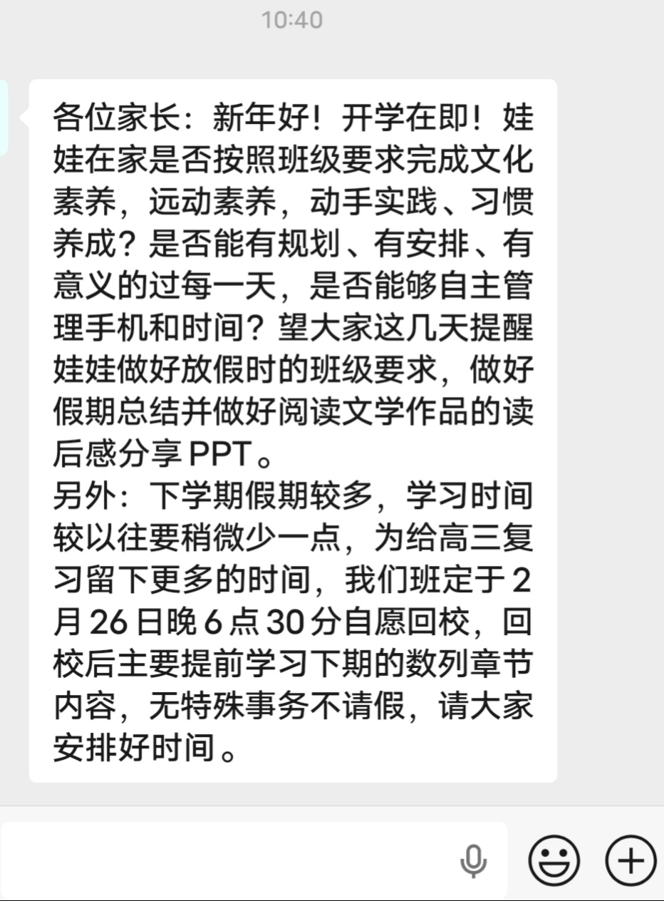 四川省泸州高级中学校2024级城西校区某位老师要求学生2月26日提前返校学习下学期数学新课,说的是自愿返校,但内容却是新课,还要求无特殊事务不准请假,原本返校时间应为3月1日