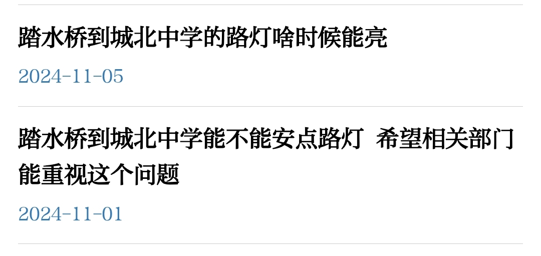 从踏水桥至城北路段,路灯问题什么时候能够解决?此路段是学生上学放学的重要经过路段,很多学生都是骑自行车出行,但是灯光一直都是很暗,还没有车辆的灯光亮,学生出行的安全从哪里来保障?做为主要经过路段,灯光照明还没有旁边新修的支路明亮。仔细观察此路段的路灯,上面是大灯,下面是小灯,但是一直以来都是开的下面的小灯,真的是太黑了,如果有相关部门能看到这个信息,可以自己去感受一下,整个城区都是亮堂堂的,唯独那一条路漆黑,而且在问政平台搜索相关问题,已经不是一次有人提出来,那么久了问题都还是没有解决,问题出在哪里?