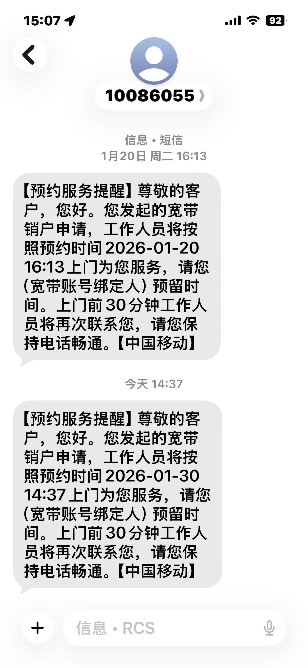 3、移动公司分别于2026年1月20日、1月30日分别短信通知上门办理宽带销号业务,但一直没有工作人员联系本人,也没有工作人员上门办理宽带销号。