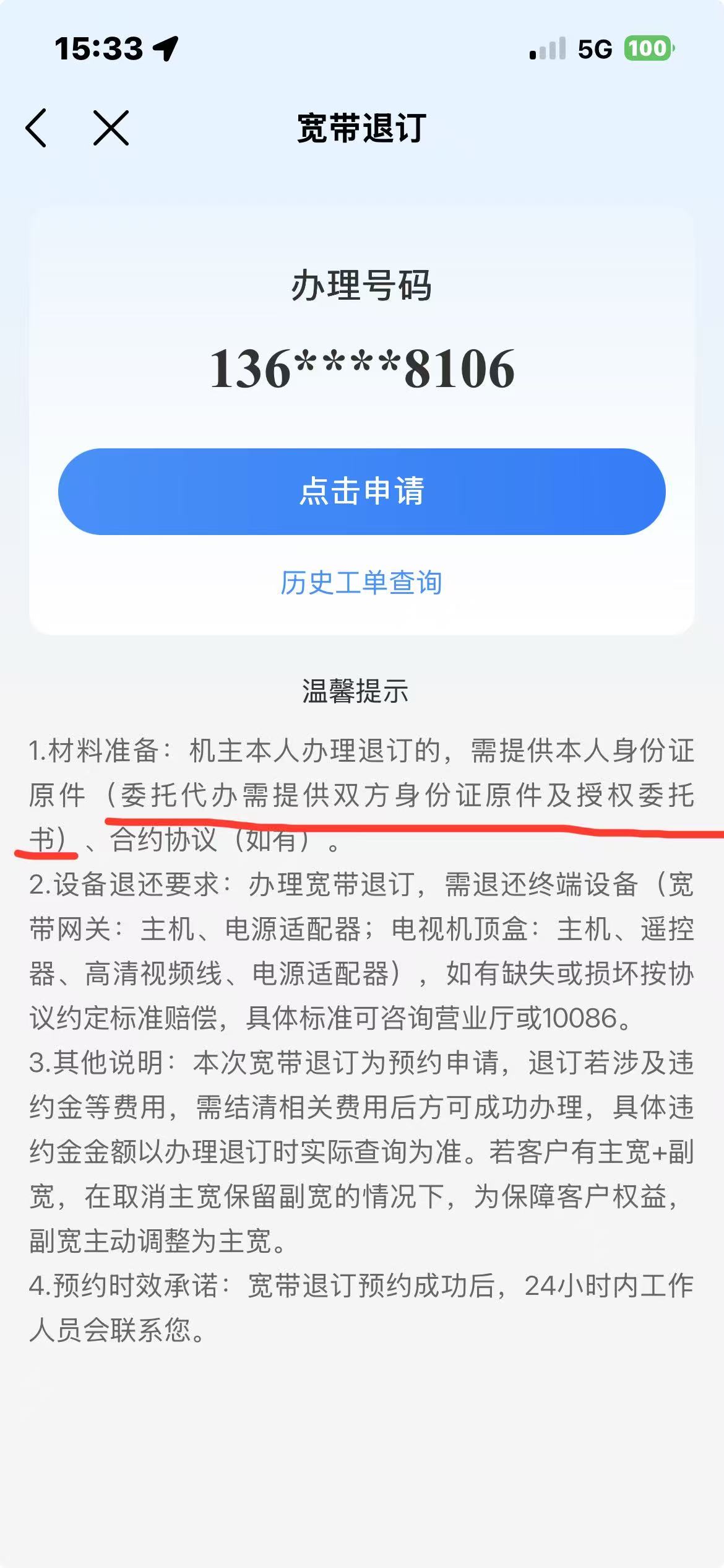 4、诉求:本人强烈要求泸州移动于5日内为本人办理宽带销号,本人已准备好相关手续委托家人办理。