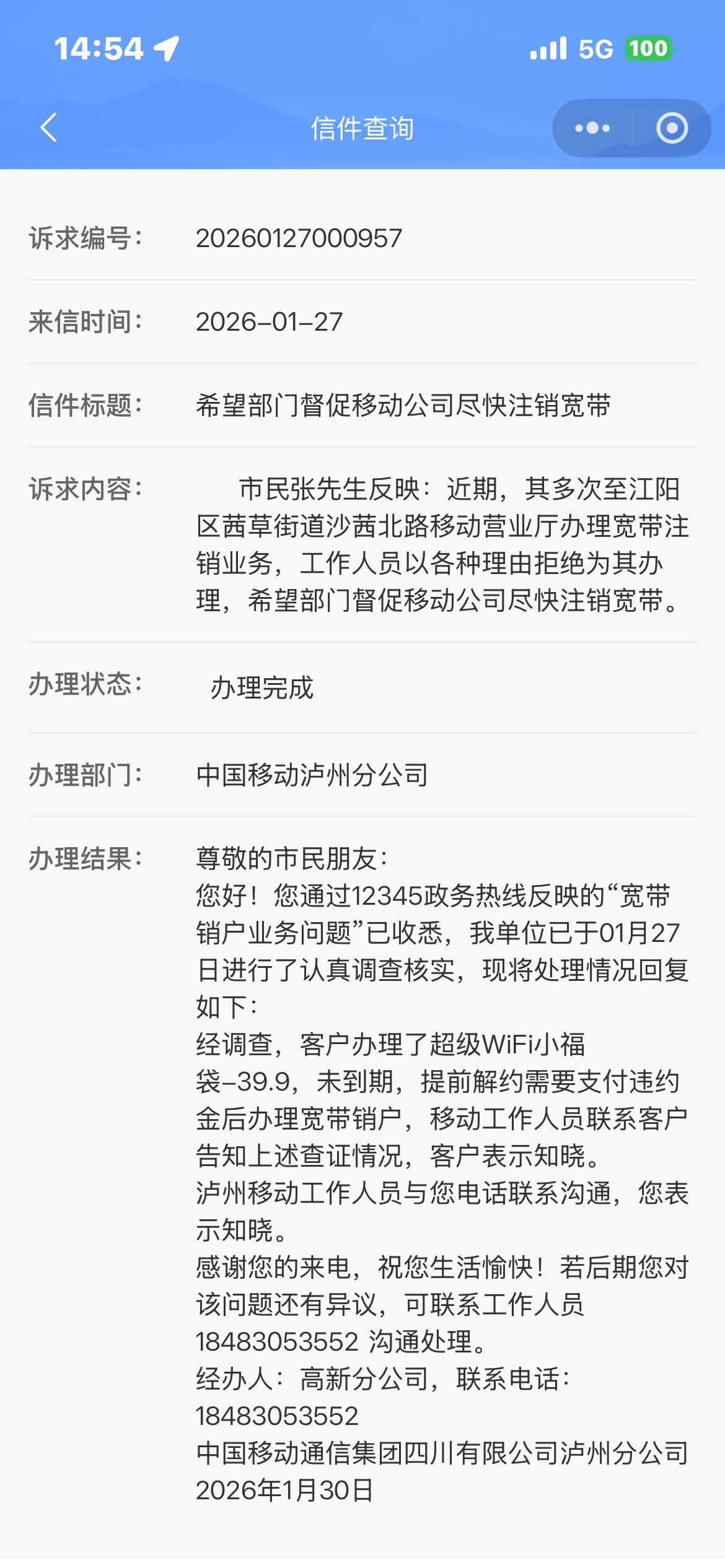 2、分别于2026年1月27日、2026年2月10日向泸州市12345市长热线进行了投诉,在本人明确同意支付违约金的情况下中国移动通信集团四川有限公司泸州分公司高新分公司至今回避、不作为,其负责人(或有权限处理此问题的人员)不与本人沟通,只安排该公司劳务派遣人员与本人联系(该人员没有宽带销号的权限),导致无法办理宽带销号,也间接导致本人多支付宽带套餐费用。