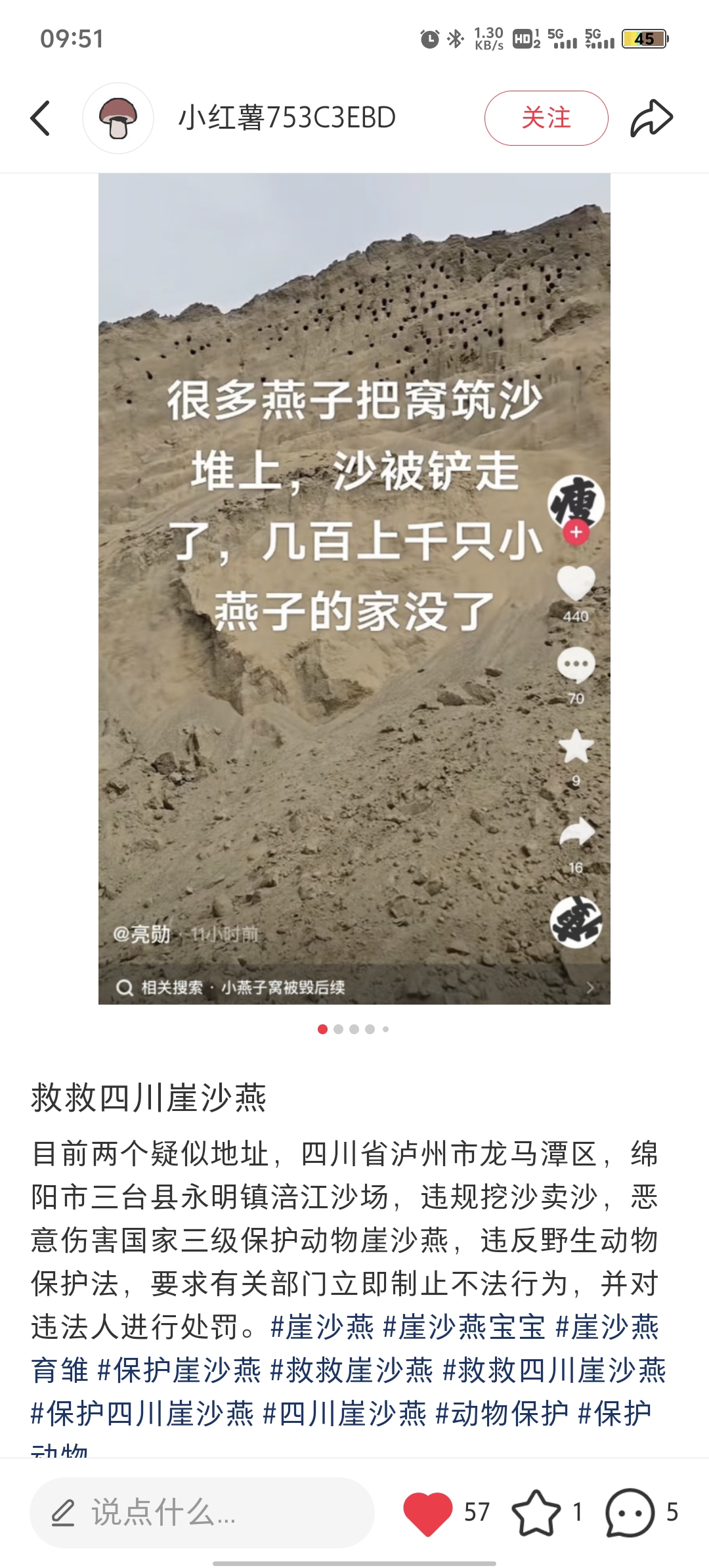 网传 四川省泸州市龙马潭区罗汉街道的土林湾附近违规挖沙,恶意伤害国家二级保护动物崖沙燕,违反 野生动物保护法 ,要求有关部门立即核实、制止不法行为,并对违法人进行处罚。