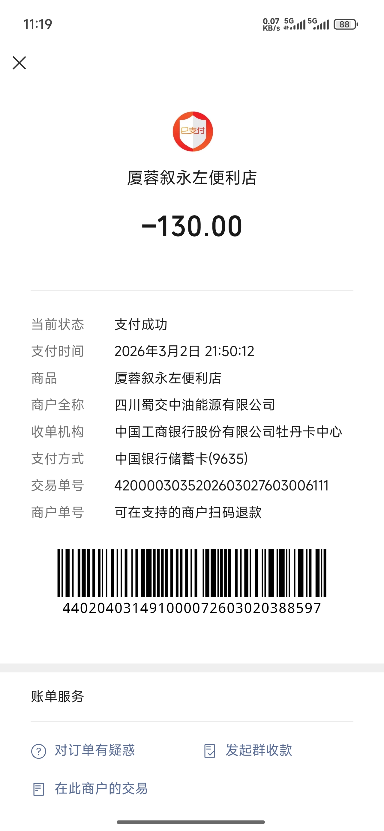 您好!您的问政内容我单位已收悉。我单位高度重视,并组织专人进行调查核实。经调查,四川蜀交中油能源有限公司(统一社会信用代码:91510104080632373F)未按规定开具发票,我局已联系督促该公司在2026年3月9日开具了相关发票,金额为130元,发票号码26512000000919432621,该发票已通过PDF形式交付给您。
