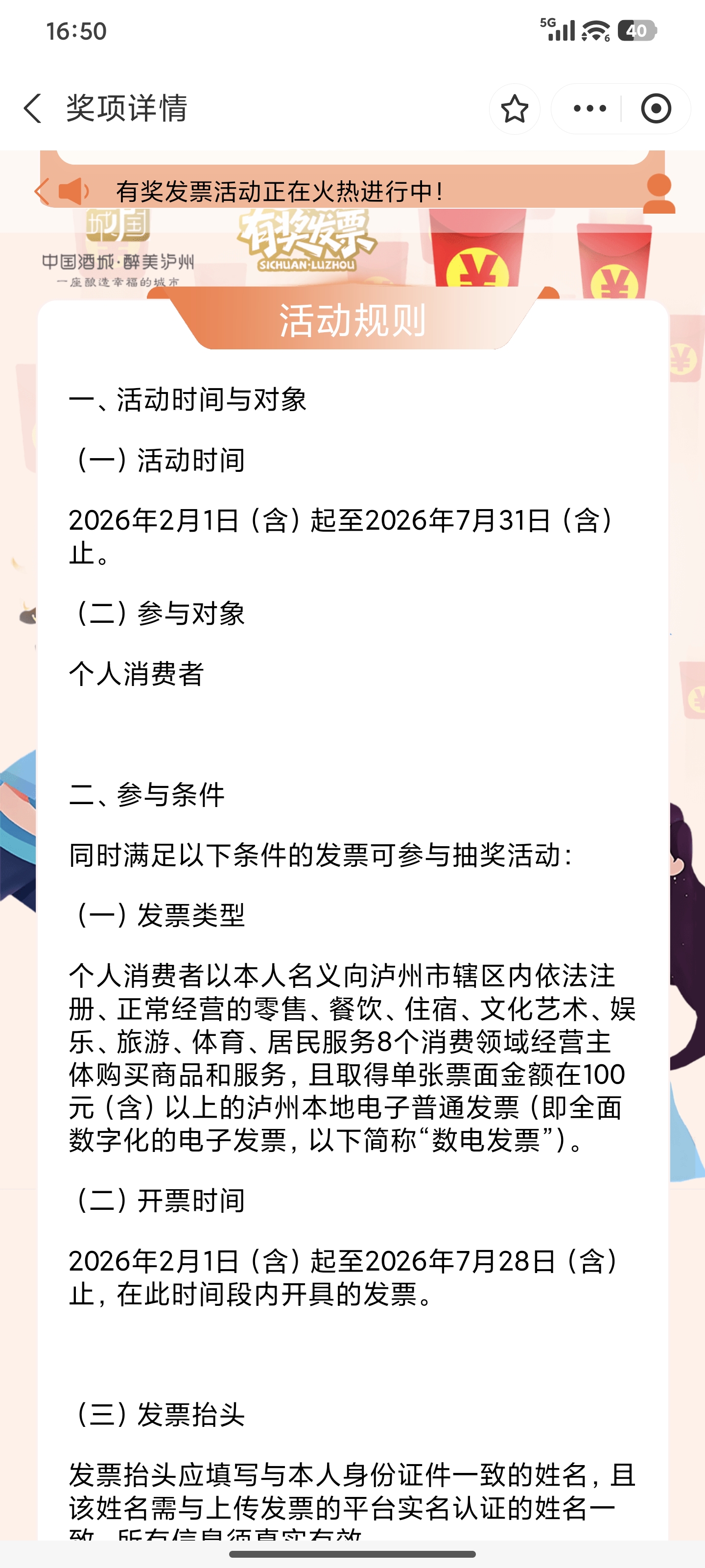 本人系未成年人,于2月23日、24日、25日参与泸州市发票有奖活动,均中奖,目前奖金状态为“待发放”,咨询后被告知因未成年无法兑付。本人参与及上传发票阶段,活动未告知、未标注未成年人禁止参与,而是标注参与对象为个人消费者。该限制为后续才增设,本人有真实消费发票为证。现正式提出两点诉求:一是请补发本人2月23-25日的中奖奖金;二是建议活动方在参与条款中以醒目标识明确标注“未成年人不予参加”,避免误导消费者。