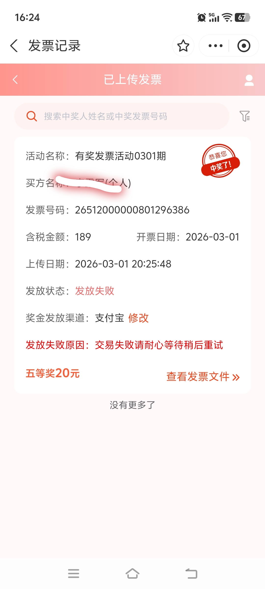 发票中奖,这个发放失败是咋回事?这期的另外的都到账了,同样的这个支付宝