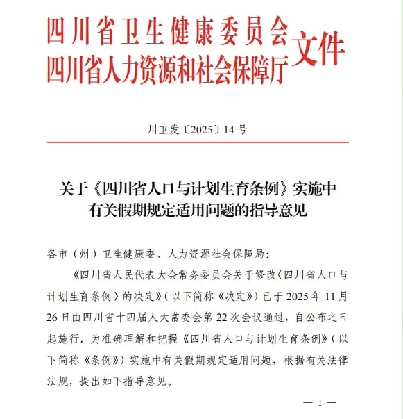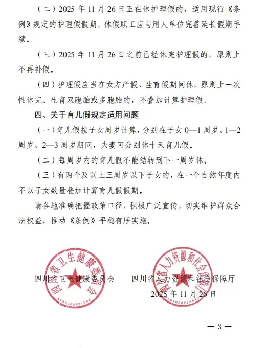2025年11月28日,四川省十四届人大常委会第二十二次会议第二次全体会议通过的《四川省人民代表大会常务委员会关于修改〈四川省人口与计划生育条例〉的决定》正式施行。符合本条例规定生育子女的夫妻,除国家规定外,延长女方生育假90天;生育第三个子女的女方,经本人申请及所在单位同意,还可以再延长生育假30天。男方享受护理假30天。子女三周岁以下的夫妻,按照子女满周岁计算,每年分别享受累计10个工作日的育儿假。县级以上地方人民政府及用人单位应当保障婚假、生育假、护理假、育儿假待遇落实。地方各级人民政府和县级以上地方人民政府有关部门违反本条例规定,未依法履行计划生育工作职责的,由上级机关或者有关机关责令限期改正,对直接负责的主管人员和其他责任人员依法给予处分;构成犯罪的,依法追究刑事责任。国家机关、事业单位、国有企业以及其他参照公务员法管理的用人单位,不落实本条例规定假期的,由有权机关责令改正,拒不改正的,对负有责任的领导人员和直接责任人员依法给予处分。前款规定以外的其他用人单位不落实本条例规定假期的,由人力资源社会保障部门责令改正,拒不改正的,依照有关法律、法规处理。职工与用人单位因对落实本条例规定假期发生争议的,依照劳动人事争议调解仲裁等有关法律、法规处理。