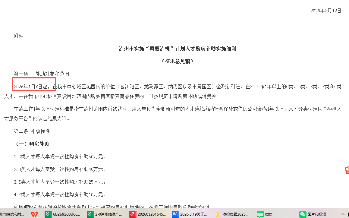 2026年1月X日起,在我市中心城区范围内的单位(含江阳区、龙马潭区、纳溪区以及市属园区)全职新引进、在泸工作1年以上的C类、D类、E类、F类和G类人才,并在我市中心城区建设用地范围内购买首套新建商品住房的,可按规定申请购房补助或消费券。