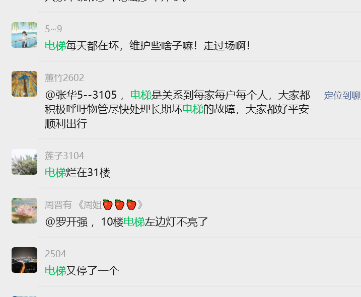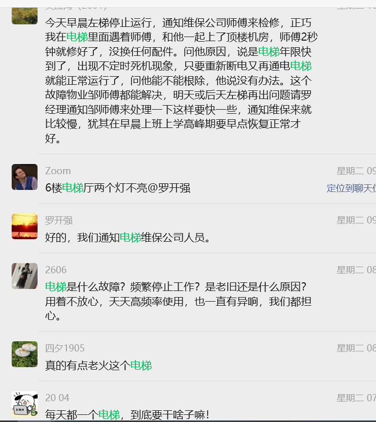 二、相关管理单位不作为。关于电梯问题业主多次向物管反映,从业主群消息查看,可追溯到2023年底(实际时间可能还会更早),每次都是通知维保公司来现场处理,恢复运行后就结束。但经常是维保人员现场处理后,很快就又再次故障导致停运,反反复复!由于近两年电梯故障频率实在太高(仅2026年3月8日-27日,短短20天时间电梯故障就高达10次)。业主建议彻底检查电梯,甚至申请更好电梯。但物业从未正面回应,均以维保现场处理来答复,或电梯使用年限要达15年才更换。