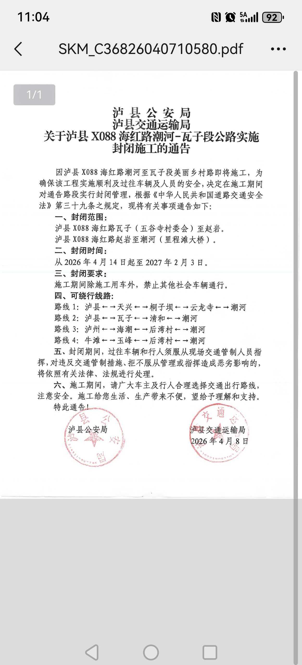 泸县瓦子到潮河修路,公式出来时间从2026.04.14到202702.03,总共8公里左右,要修近一年,对瓦子到潮河之间的出行造成严重出行不便,招投标工作明确施工时间能否缩短,8公里工期修一年,高速都要不到弄么久,督促一下修路时间,加快中标施工单位工作日志,怎么修弄久?