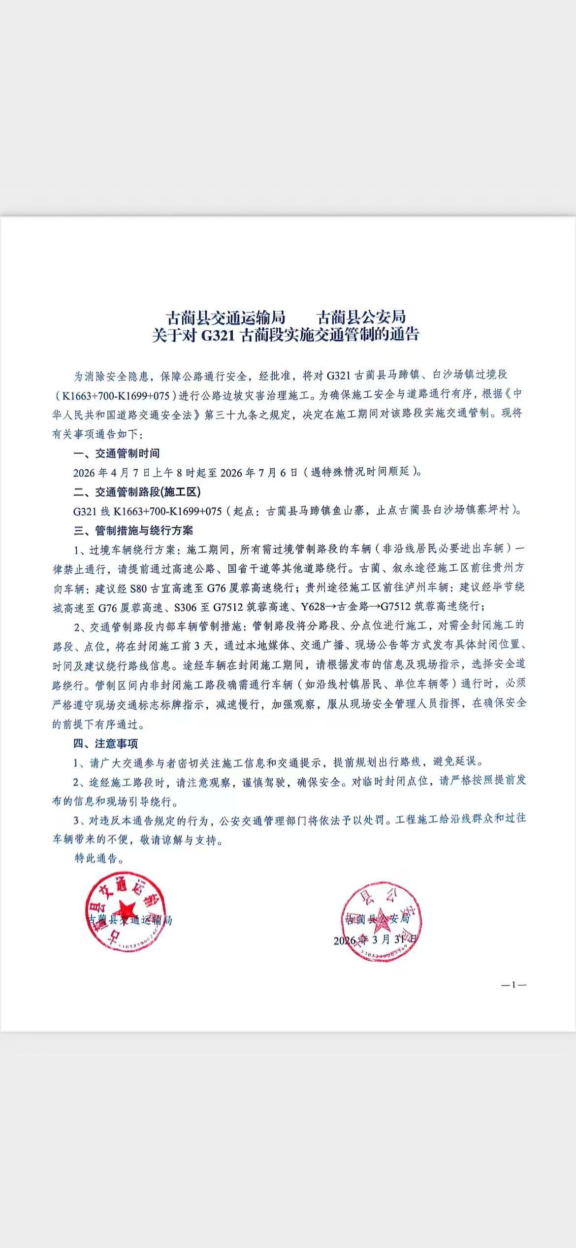 G321国道古蔺县马蹄镇、白沙场镇过境段(K1663+700-K1699+075)是西南出海辅助通道的重要组成部分。经专业检测,该路段边坡存在较大安全隐患,为消除安全隐患,保障人民群众生命财产安全和公路长期通行安全,经上级批准,对该路段实施公路边坡灾害治理施工。根据《中华人民共和国道路交通安全法》第三十九条之规定,决定在施工期间对该路段实施交通管制。交通管制时间为2026年4月7日上午8时起至2026年7月6日(遇特殊情况时间顺延)。本次治理工程涉及边坡开挖、锚固、防护等多个工序,作业面广、施工周期长。边坡治理施工期间,存在高边坡落石、坍塌等安全风险,即使非施工时间,施工区域内仍有机械设备停放、边坡尚未稳定,开放通行可能对过往车辆和人员造成不可预测的安全威胁。为确保施工期间的绝对安全,经公安交管部门和施工单位联合评估,决定对该路段采取全封闭施工措施,施工期间所有需过境管制路段的车辆(非沿线居民必要进出车辆)一律禁止通行。为确保施工期间车辆顺利通行,我局已会同公安交管部门制定了详细的绕行方案:古蔺、叙永途经施工区前往贵州方向车辆,建议经S80古宜高速至G76厦蓉高速绕行;贵州途经施工区前往泸州车辆,建议经毕节绕城高速至G76厦蓉高速、S306至G7512筑蓉高速、Y628→古金路→G7512筑蓉高速绕行。此外,我局已将相关管制信息通过古蔺融媒、交通广播、现场公告等多种渠道提前向社会发布,提醒广大群众提前规划出行路线,尽量选择公共交通或拼车出行,以降低出行成本。工程施工给沿线群众和过往车辆带来的不便,我们深表歉意,敬请谅解与支持。我局将持续优化施工组织方案,在确保安全的前提下,尽可能加快施工进度,力争提前完工恢复通行。同时,我局将督促施工单位做好施工现场的安全管理和交通引导工作,最大限度减少对群众出行的影响。如在出行过程中遇到其他困难或问题,欢迎您拨打我局咨询电话(0830-7205357),我们将竭诚为您服务。