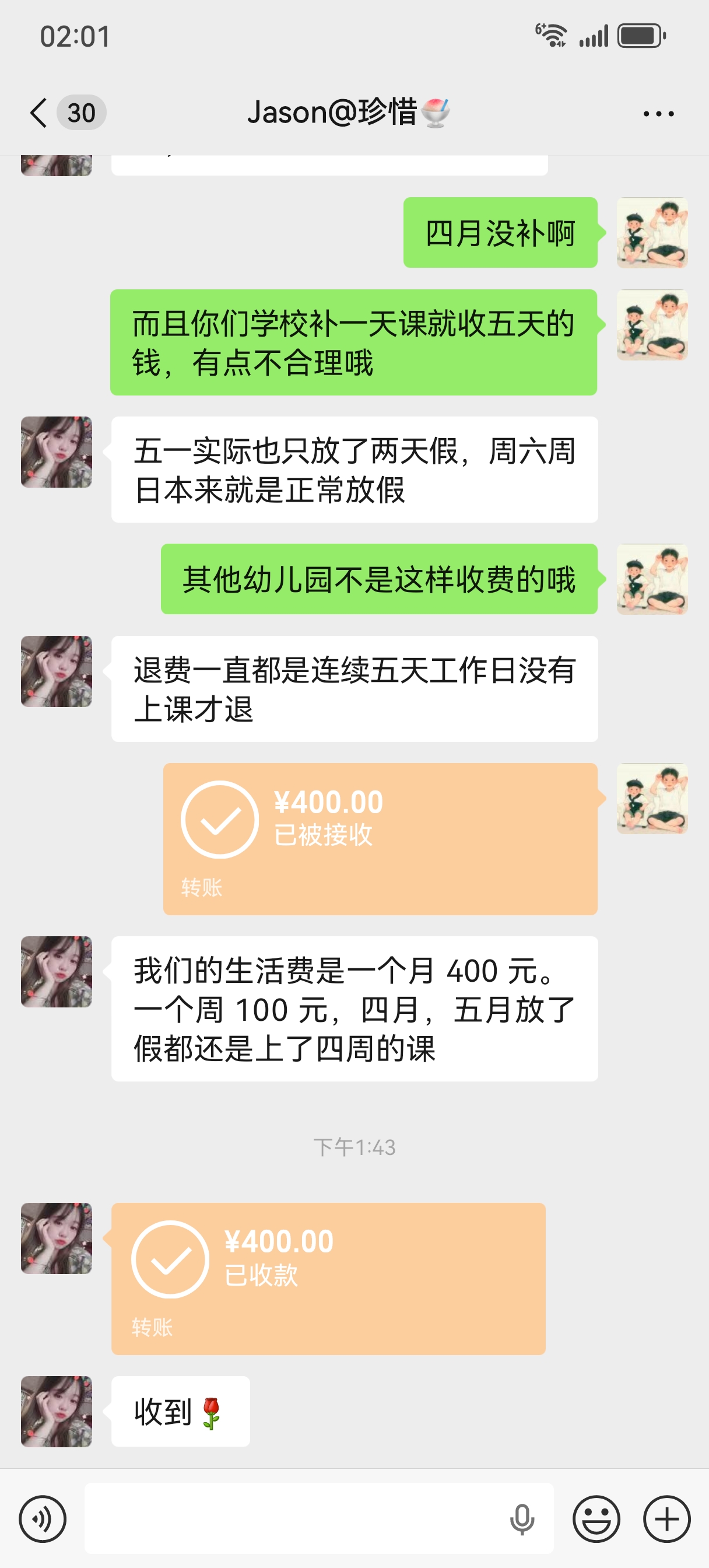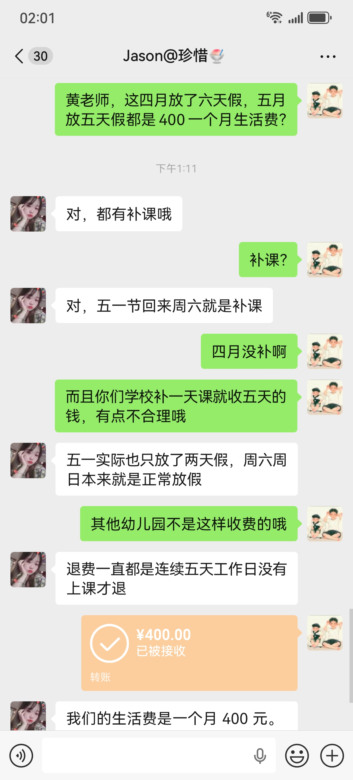 四月放了六天假(清明节和春假),五月放五天(五一假),按照原每月生活费400元正常收取,请问这合理吗?