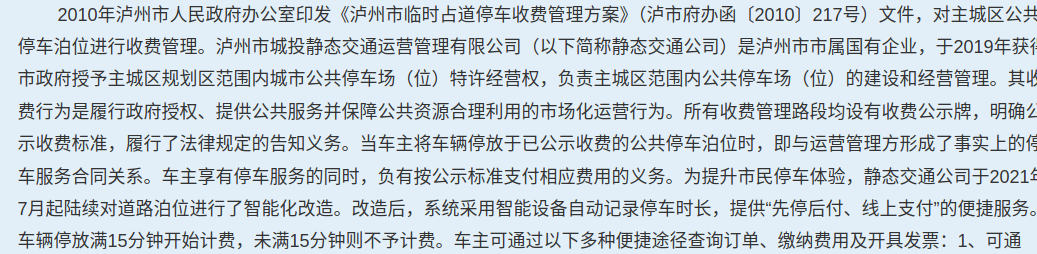 关于问政酒城易泊收费的回复中提到,他们的收费依据是:“2010年泸州市人民政府办公室印发《泸州市临时占道停车收费管理方案》(泸市府办函〔2010〕217号)文件,对主城区公共停车泊位进行收费管理。于2019年获得市政府授予主城区规划区范围内城市公共停车场(位)特许经营权,负责主城区范围内公共停车场(位)的建设和经营管理。其收费行为是履行政府授权、提供公共服务并保障公共资源合理利用的市场化运营行为。” 请问一个管理方案既不是规范性文件,也不属于法律法规条例,并不具有法律效力,而且该文件已过有效执行期,为什么酒城易泊收费依然按照2010年的文件执行收费到现在。