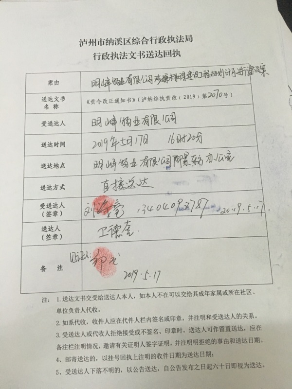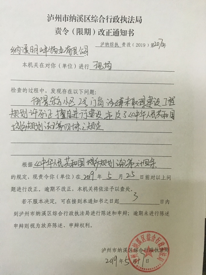 经核查,关于“御景东方小区2号门岗问题”,我局执法人员于5月18日对泸州明峰物业服务有限公司下达了《责令(限期)改正通知书》,5月25日《责令(限期)改正通知书》到期后,泸州明峰物业服务有限公司没有按通知书要求履行整改。为此,我局执法人员将此问题列入立案调查处理,于5月28日起开启案件调查处理工作。现阶段,我局按照法定步骤和规定程序,正进一步收集证据、完善资料,逐步推进调查工作,力争在法定的时限内结案。
