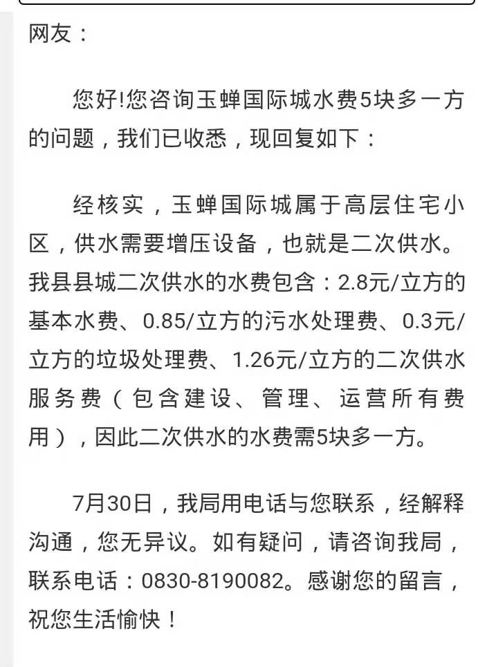 二、您所反映的5.21元/吨的水价中,包含了基本水费2.8元/立方米(0.05元水资源费)、垃圾处理费0.3元/立方米、污水处理费0.85元/立方米和二次供水服务费1.26元/立方米,其中:基本水费、垃圾处理费、污水处理费,县发展改革局分别以泸县发改价综〔2014〕21号、泸县发改价费〔2013〕51号、泸县发改价综〔2017〕 3号文件对价格进行了制定;目前兴泸集团泸县分公司收取1.26元/立方米的二次供水服务费,是由该供水企业根据提供二次供水服务所产生的成本,采取在供水合同中约定的方式向用水户收取。