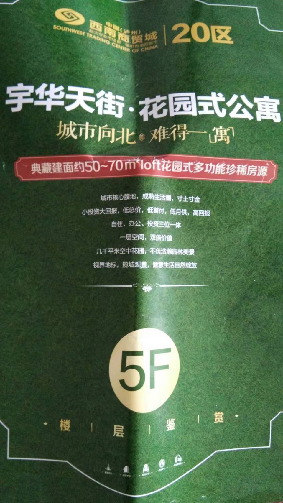 你好!我想反映一下西南商贸城20区宇华天街的情况 1.虚假广告宣传:广告宣传承诺层高3.9-4.8米!销售顾问承诺可以隔层!实际层高完全不符!并且,有横梁在屋中间!根本无法装修!承诺的楼顶夜光塑胶跑道现在也明确表示不会修了! 2.设立虚假样板间,销售误导!当初买房前观看的样板间于现在的实体房出入巨大! 3.公寓变商铺。当初买房时和广告上写着是公寓,住房,而实际房却变成了商铺!当初承诺的民用水电气全部变成商用!且还需要自己安装! 4.公摊面积太大!当初买房时承诺公摊面积只有30%至40%,而实际房间公摊超过50%! 我想咨询,针对以上问题,贵局是否应当监督职责,成为我们业主的坚强后盾,为民做主!