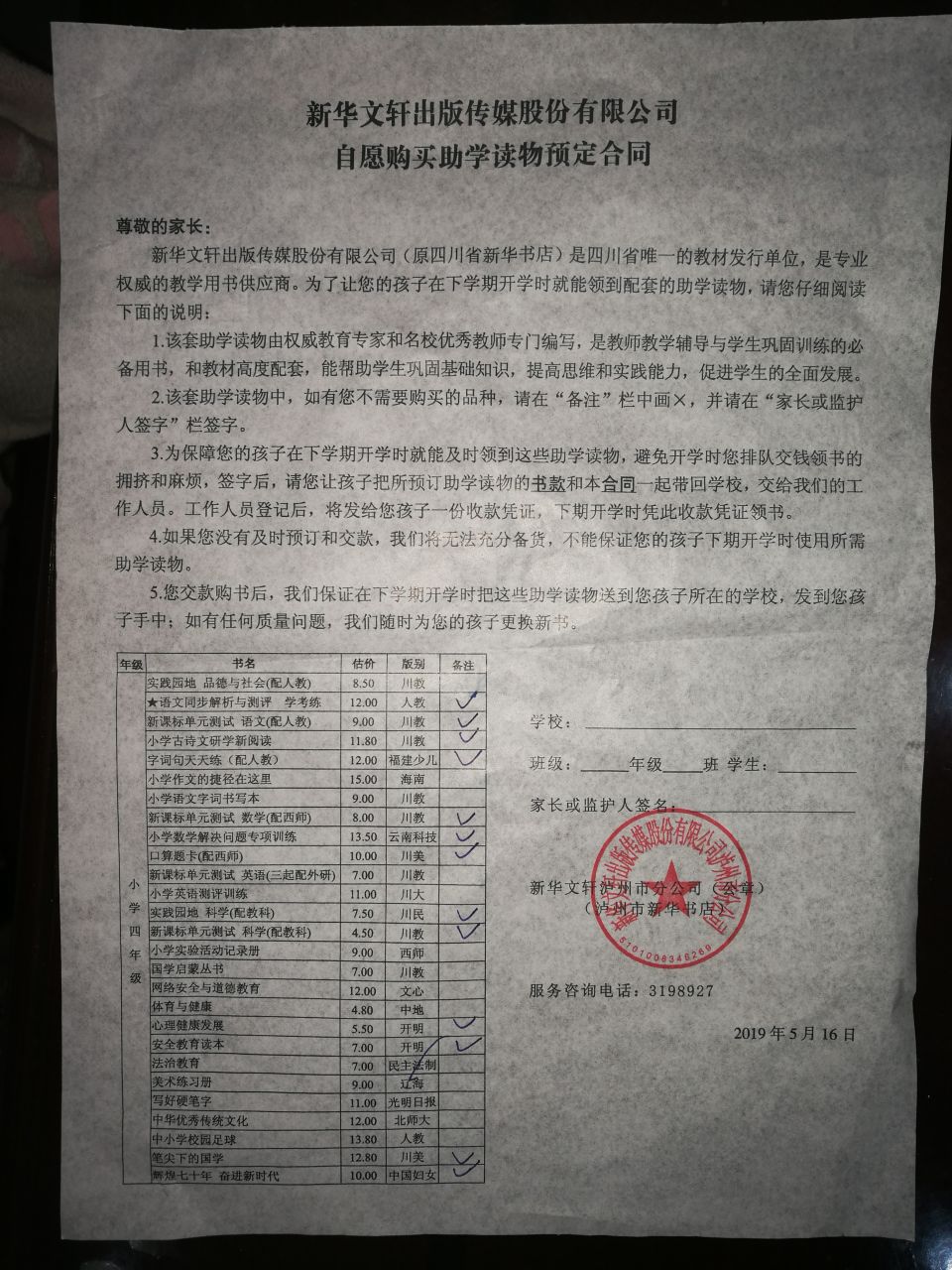 3.关于“替文轩书店发《自愿购买助学读物预定合同》并勾选内容”的问题。教辅资料分为学校代购书目和自愿认购书目,学校代购书目按照市上规定购买,自愿认购书目孩子家长自愿购买;自愿认购书目“勾出内容”,是学校结合学科特点、教材内容、孩子发展等因素,组织各年级各科教师共同讨论出的推荐书目,此勾选书目仅作推荐作用,家长可选可不选;“自愿购买助学读物”为家长自愿购买,并非学校与书店“勾结”,并非强制性购买,自愿购买的家长在“预定合同”上签字,若不愿购买可以不用签字。