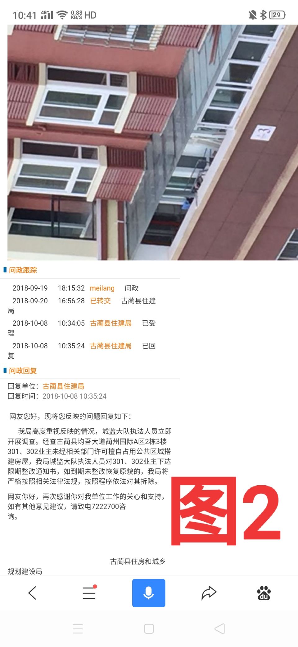 3:蔺州国际2号楼3楼平台属于整栋楼公摊面积,为何前期向相关部门反映了后得到的回复是马上处理,在过去一年多时间都没有处理?(有相关部门当时回复的证据)见图2。