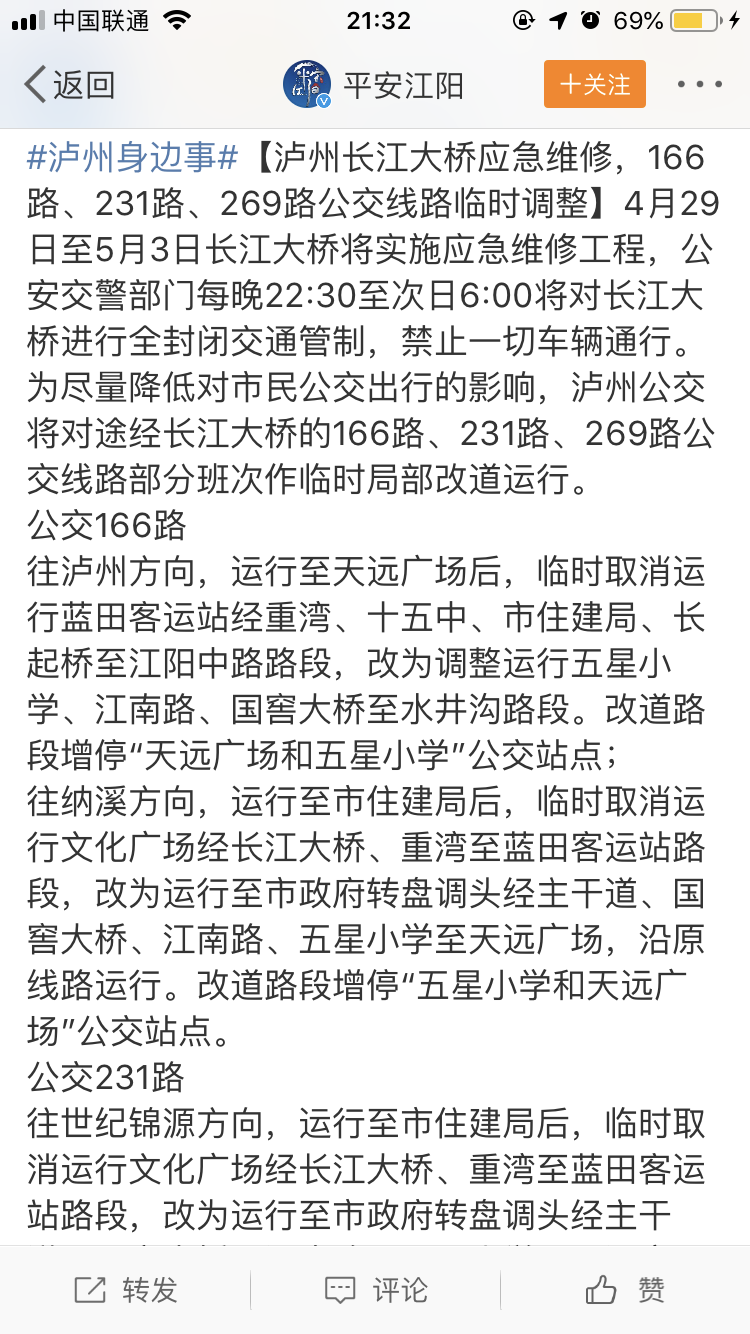 关于长江大桥封闭维修时间为7-9月,公交线路具体调整时间还未确定。线路运行调整会第一时间在“泸州公交”微信公众号、公交网站进行公布,您可及时进行关注,了解最新信息。